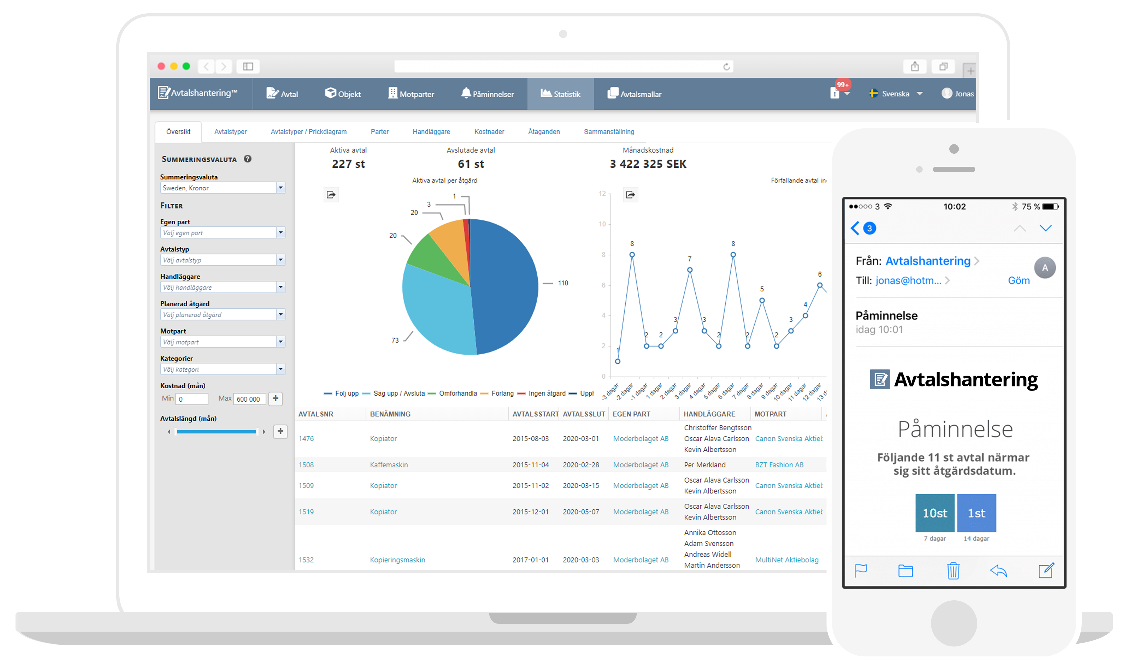 När ert avtal är registrerat så skickas påminnelser automatiskt till rätt person via e-post och SMS, så att du aldrig missar att säga upp, förlänga eller omförhandla ett avtal.