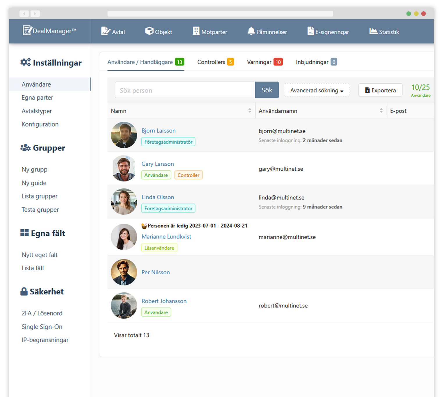 Med inbyggt stöd för digital signering kan du på ett enkelt och säkert sätt hantera hela signeringsprocessen direkt i DealManager. Bjud in personer att granska, godkänna och signera avtal digitalt, med eller utan BankID.